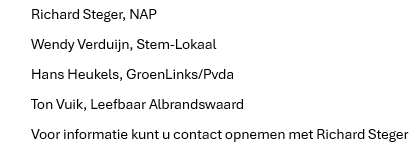 Na een lang debat en vele vragen vanuit de gemeenraad inzake het dossier Flexwoningen is na middernacht de motie tot stand gekomen. Hierin is de tekst opgenomen gelijk aan de motie van wantrouwen inzake het dossier van de Julianaschool in december 2024 te weten gericht aan het gehele college van burgemeester en wethouders. De indieners van de motie van wantrouwen van afgelopen maandag benadrukken dat op geen enkele wijze deze motie betrekking heeft op Burgemeester Pille. We betreuren de gemaakte fout, welke hersteld zal worden tijdens de extra raadsvergadering van 27 oktober 2025.